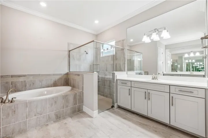 Retreat to the master bedroom, bathed in natural light from large windows and sliding glass doors offering direct access to the pool and lanai. The master bathroom is a spa-like oasis with his and hers walk-in closets, separate vanities, and a separate soaking tub and shower.