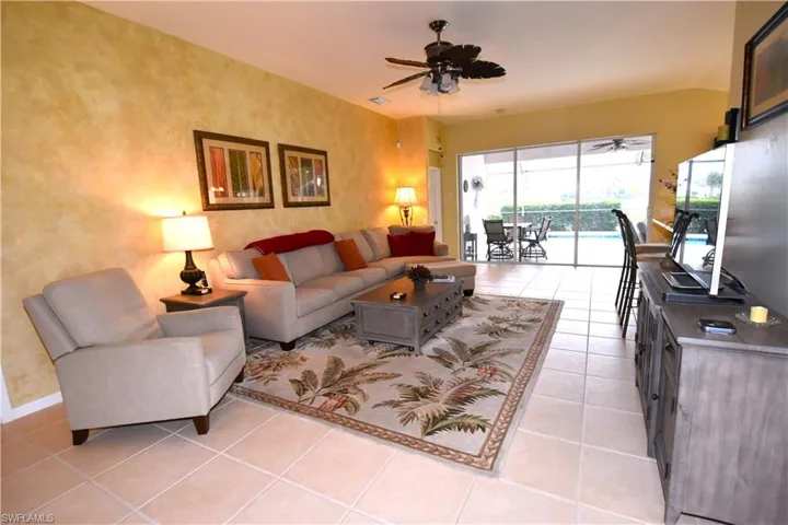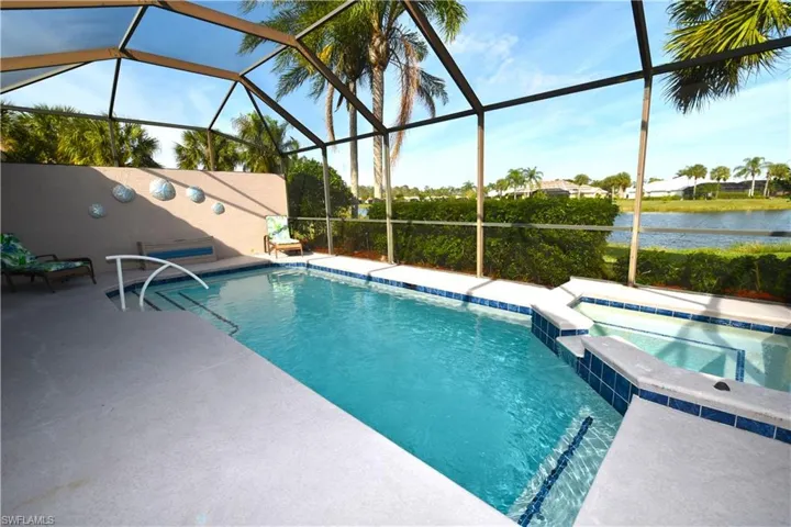 This is the LARGEST twin villa lot in the whole community! 2020…POOL and SPA were completely refinished and redesigned with a new pool heater and larger seating inside the pool. Invite all your friends!!! NEW ROOF in 2021. New microwave in 2023. Most furniture stays with the home. Boasting over 1700 square feet this open floor plan has a den/office with a built-in queen size bed and home office furniture. Accordion shutters on lanai for storm protection. Community offers the best amenities around with Tennis, Pickleball, Bocce ball, State of the art fitness, Restaurant with weekly entertainment, Preserve with miles of paths, and sidewalks throughout community. This home is on the pay as you play golf side of the community with no annual golf maintenance fees. Close to airport, Red Sox and Twins training camps, hospitals, and shopping. Come and enjoy the Country Clubb lifestyle!