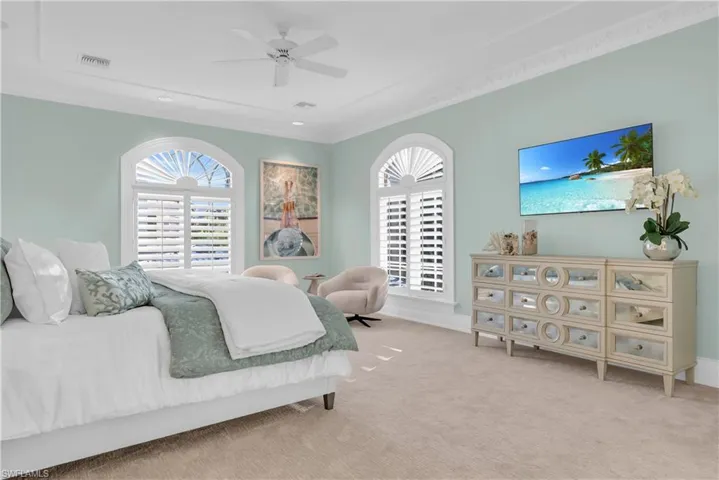 An exterior spiral staircase leads to the rooftop deck, complete with built-in seating—an extraordinary vantage point to enjoy Naples’ moody skies and breathtaking sunsets. Outdoors, soak up the sun by the resort-style pool, unwind in the spa, or host gatherings in spaces designed for effortless entertaining. This home is ideal for philanthropic events, elegant soirées, and memorable family celebrations.