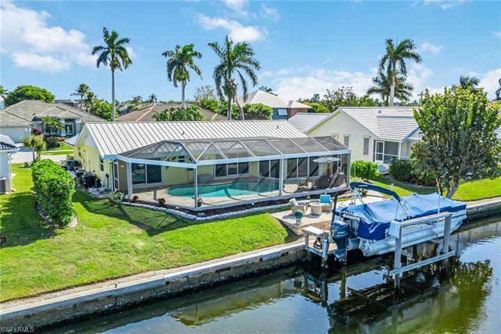 Move in and start enjoying the island lifestyle. This two-bedroom plus den Marco Island home features gulf access and unobstructed wide-water views and includes the Bennington Tritoon boat! Outdoor features include a composite boat dock with a 9,000-pound boat lift, a picture-window screened lanai and heated pool. The conveniently laid-out home features a double-door entry that leads to a bright, spacious living and dining area with neutral, on-the-diagonal tile. The kitchen, with white cabinets, a full pantry and stainless steel appliances, includes a new refrigerator and microwave. The primary bedroom with an en-suite bath has private access to the lanai and pool area. Additional features include a stamped concrete patio and driveway, a security system, a metal roof, and impact-resistant windows and doors throughout. This ideal location, by boat or car, is minutes from restaurants, shopping and the picture-perfect Marco Island beach.