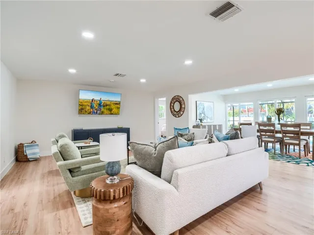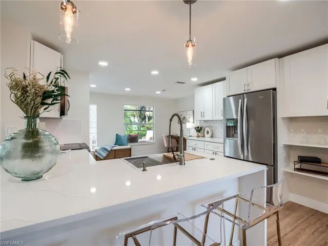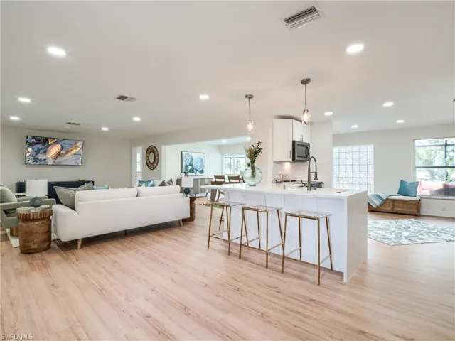 TROPICAL CHERT – 547 Chert Court; a lair near the beach amongst the tropics of Sanibel! This 3 bedroom, 2.5 bathroom, pool home offers the best of the #IslandLifestyle. Situated amongst a quiet cul-de-sac in the East Rocks Community, this property offers deeded beach access! This spectacular oversized property greets you with a custom paver driveway lined with mature royal palm trees. Step inside to witness the detailed renovation that includes impact windows and doors, coastal furnishings, stainless steel appliances, custom wood cabinetry, quartz countertops with a waterfall island, luxury vinyl plank flooring, and updated bathrooms. Bright and airy bonus room off kichen for a perfect home office, den or breakfast nook along with a rare oversized laundry and pool bath area offering additional interior storage. Sold furnished and accessorized with all new appointments including living room smart TV, lanai sofa set and lounges for a hassle-free transition! Immaculate 2-vehicle garage with epoxy covered flooring! This is a perfect primary, vacation or investment property on the west end of Sanibel. Rental analysis available. Floor plan included in the gallery of photos. CLICK the link to the property tour and don’t miss the opportunity to own your slice of paradise.