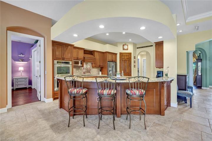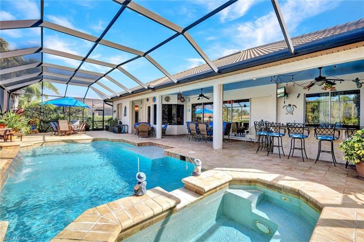Stunning architectural details pair with the finest options and upgrades in this pool residence with a peaceful lake view. A spacious living area with coffered ceilings opens entirely to the pool and spa area with an outdoor kitchen and extended lanai, perfect for entertainment and alfresco living. The custom-designed kitchen offers 42-inch cabinets with under-cabinet lighting, plenty of storage space, island with a second sink, double oven, range hood, granite countertops and a breakfast nook with a panoramic view and easy access to the pool area. Additional home features include hardwood flooring in all bedrooms, stone flooring in the main area, reverse osmosis filtration system, Bose surround sound in the main lining area, master bedroom and outdoor speakers on the lanai, recessed ironing board in the laundry room and additional parking space in front of the home. The electric shutters on the lanai and accordion shutters on all other windows provide safety and convenience during the storm season. Great location with easy access to I-75, the airport, baseball stadium and minutes from some of the best beaches, shopping, dining and entertainment in Southwest Florida.