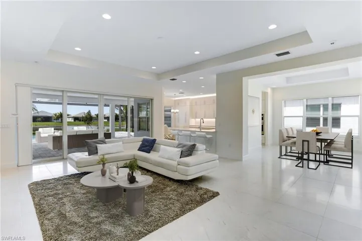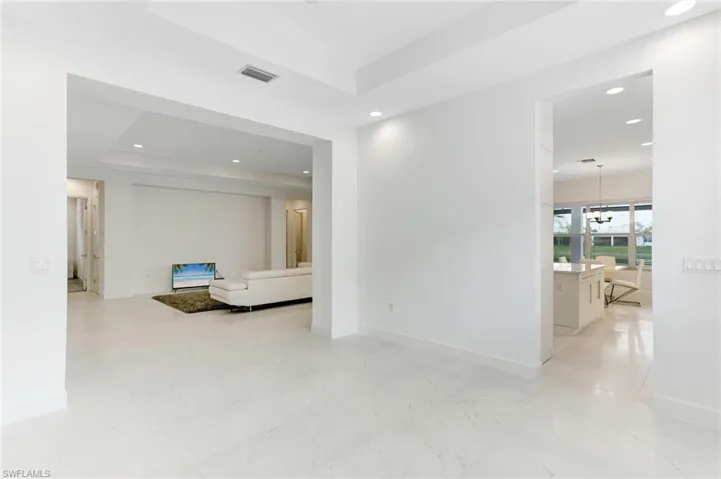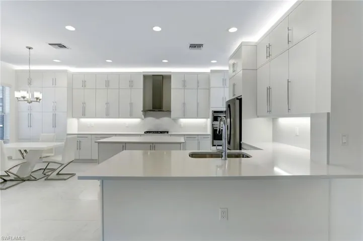Inside, an inviting open floor plan awaits, meticulously crafted to accommodate both intimate gatherings and grand affairs. Discover a formal dining room seamlessly connected to your gourmet kitchen, adorned with top-of-the-line GE Profile appliances, double-stacked cabinets, and built-in pantry. Enhancing the culinary experience is a sophisticated wet bar, overlooking the expansive living area, perfect for entertaining in style.