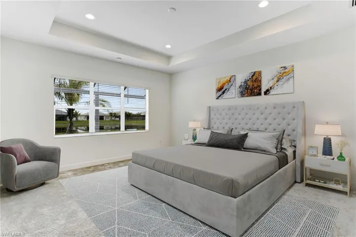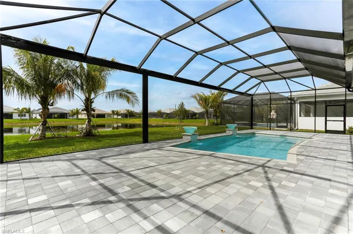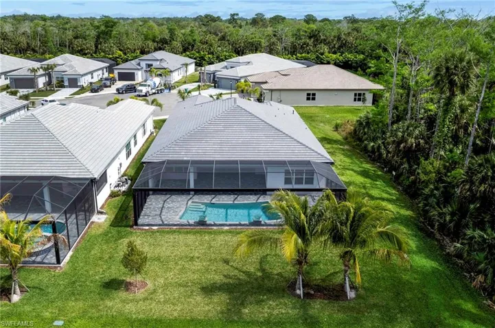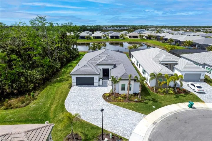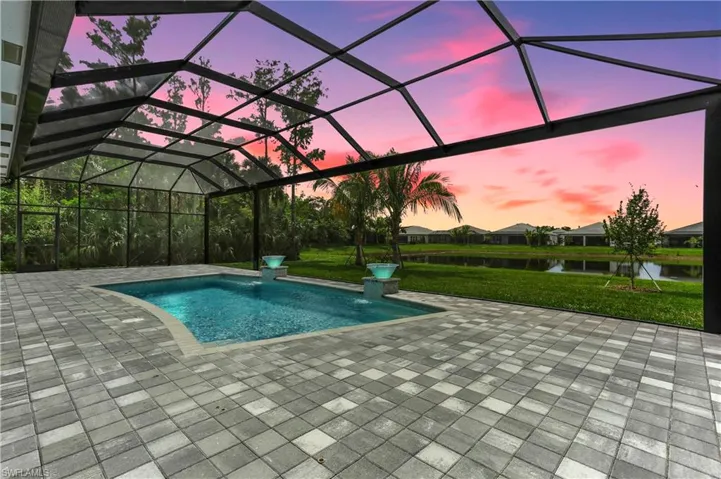 A Like-new Estero Model pool home with extended lanai, on a private, oversized lot within the exclusive Valencia Trails community. This sprawling 3 Bed+Club Room, 3-car garage residence sits majestically on a picturesque lakefront lot, culminating in a tranquil cul-de-sac setting. Enjoy unparalleled privacy and breathtaking western exposure lake views from your expansive lanai, adorned with panoramic screens.