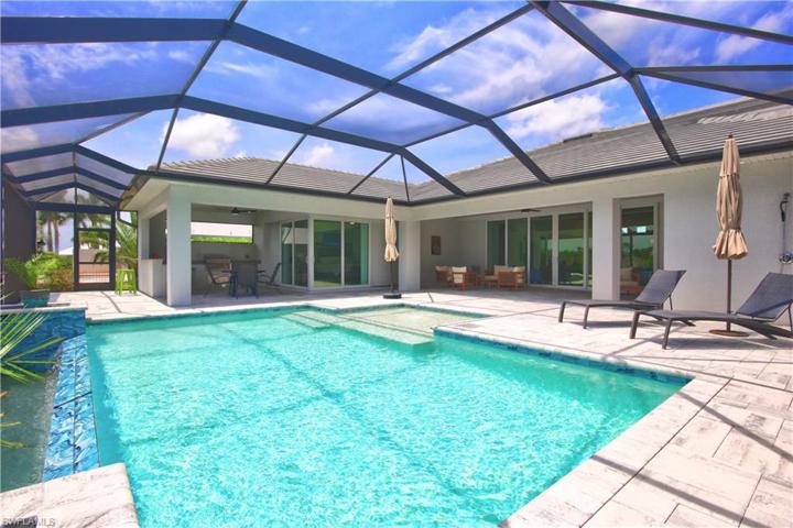 The epitome of SW Cape Coral luxury gulf-access living is found is this 2021 custom built masterpiece. A lifetime of captivating sunsets await you while you gaze over the highly sought after Spreader Canal (pictures feature actual sunset!). Unlike most lots on the Spreader, you have approximately 155 ft of water frontage & are situated at the end of a quiet cul-de-sac. You’ll enjoy nearly 3,000 sq.ft. under air w/3 beds + den, 2.5 baths (pool bath), & over 2,600 sq.ft. of outdoor living, including a negative edge pool, composite dock, multiple covered living spaces & an outdoor kitchen. Your outdoor living is accessible by a wall of pocket sliders & 90° degree pocket sliders. The inside is protected by hurricane impact resistant glass and handled Ian well. Inside you’ll find modern, luxurious finishes throughout including gorgeous floors, a beautiful kitchen w/ a huge walk-in pantry, & tastefully upgraded baths. While the pool appears to sit on the side of the home, once inside, the orientation of the home faces the canal providing water views from nearly every room. Here you can wake up every morning with a nearly 1/4 mile long water view from your bed.