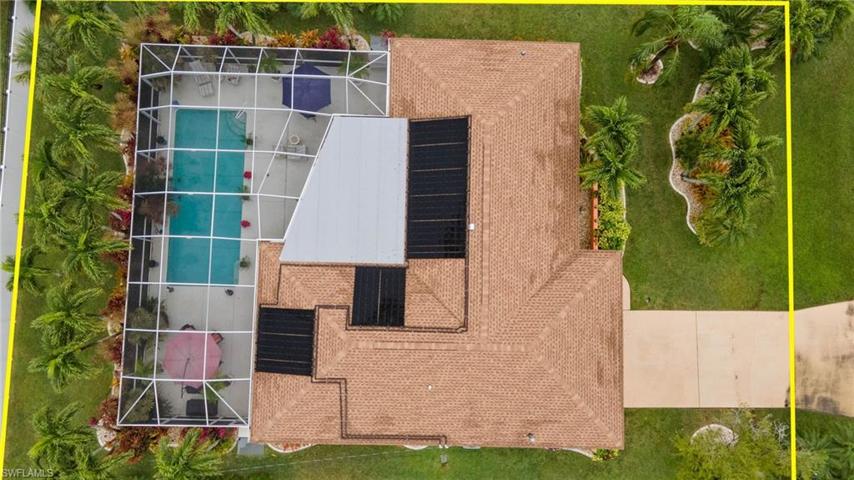 Welcome to your piece of Florida paradise. This three bedroom home in Southeast Cape Coral has an absolutely HUGE Southern rear exposure pool area. This private tropical setting features a large screened and solar heated pool with water feature, a large shaded sitting area, a pool bath, and multiple pocket sliders leading into the living area. The house is tiled throughout with two separate living spaces, a fully updated kitchen, and a laundry room. Other upgrades include fully remodeled bathrooms, walk-in closets in every bedroom, a brand new roof, new top of the line pool pump and filter 2023, and a new electric panel in 2019. Outside the landscaping has been meticulously maintained with concrete curbing, lots of palms, and a new privacy fence in the back. Did I mention no flood insurance is required. Schedule your appointment to see this home today and see what you have been missing!