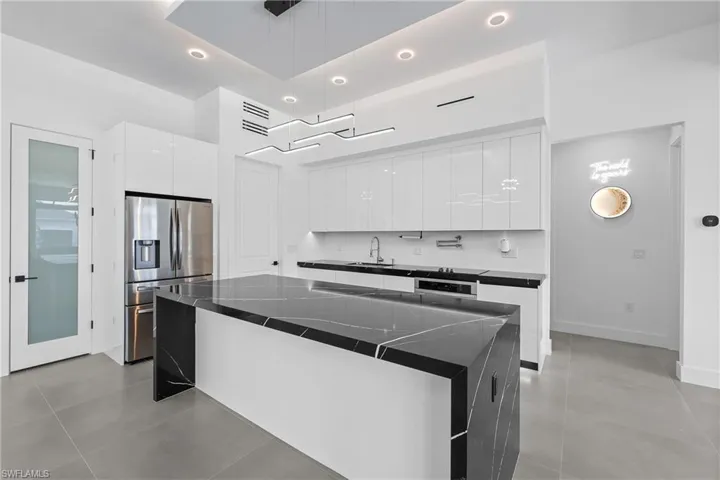 With three bedrooms and two and a half baths, this home offers ample space for both relaxation and productivity. Two-toned lighting fixtures illuminate throughout the whole house. An office provides a dedicated workspace. Fully dressed closets ensure getting the most out of your space. With central vacuum installed making a sleek and convenient solution for maintaining a pristine home environment. Escape to the screened-in pool area, where you can enjoy refreshing dips year-round. A outdoor kitchen adds convenience to outdoor entertaining, a half bath for your guests and an outdoor shower to clean off. Additional features include floating cabinets in the laundry room and bathrooms, impact windows/doors, tankless water heater, quartz countertops windowsills throughout, St Augustine grass, custom blinds installed and blackout for master bedroom sliding glass door, 3 access points throughout including outdoors, and a modern house design that’s sure to impress. Don’t miss your chance to experience luxury living at its finest in this must-see home!