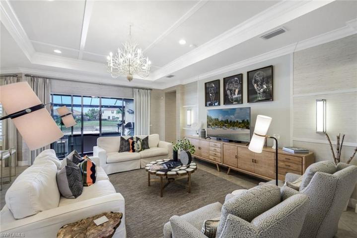Welcome home to this beautifully designed lake front sanctuary located in Marina Bay. This gorgeous home is a rare offering — an original model that has since been thoughtfully updated featuring luxurious details. Immerse yourself in the impeccable outdoor living area, showcasing a magnificent contemporary custom pool & spa, wonderful covered seating area, beautiful fire table, and custom outdoor kitchen. Enjoy the picture window screened lanai highlighting an unbeatable view of the lake and sunsets. The gourmet kitchen is a masterclass in refinement, with premium appliances set against custom cabinetry and a grand quartz island — inviting both culinary exploration and entertaining! Flowing from the kitchen is the open living room, complete with a custom trey ceiling and designer crafted wall details. The primary suite offers a wonderful nightly escape including an ensuite bathroom featuring quartz countertops and designer fixtures. Come experience the best that Marina Bay has to offer, a wonderful community amazing amenities!