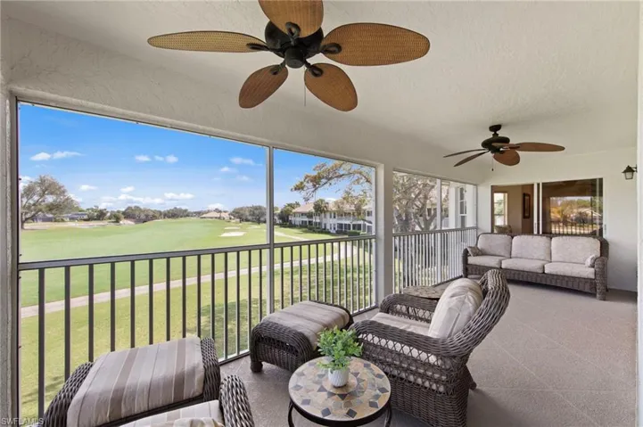 Located at the end of a peaceful cul-de-sac, this PRIVATE END UNIT in Grand Palm Village at The Vines, this three-bedroom, two-bath corner condo offers nearly 1,500 square feet of thoughtfully designed living space paired with one of the most impressive golf course views in the community. With desirable eastern exposure, the expansive wrap-around lanai allows you to enjoy panoramic golf course views across multiple fairways of Estero Country Club, creating a serene and private backdrop. The open great room and dining area flow effortlessly toward the lanai, complemented by plank tile flooring throughout the interior main living spaces for a refined, cohesive look. The updated kitchen features granite countertops, elegant white cabinetry, Whirlpool stainless steel appliances, recessed lighting, and a pantry, flowing seamlessly into the great room where continued recessed lighting enhances the bright, open feel. The spacious primary suite enjoys private lanai access, a large bay window overlooking the course, an oversized walk-in closet, and an updated ensuite bath with dual sinks, a jetted soaking tub, and a separate walk-in shower. Two additional guest bedrooms provide flexibility for visitors or a home office. Notable updates include a 2016 roof, 2021 A/C system, 2019 water heater, 2020 garage door opener, and several kitchen appliances replaced in 2021, offering added peace of mind. The condo is finished with an oversized two-car garage complete with a golf cart charging outlet. Grand Palm Village residents enjoy a private community pool within the welcoming setting of The Vines. Residents of The Vines have the opportunity to enjoy Estero Country Club’s championship golf, tennis, pickleball, fitness center, dining venues, and vibrant social calendar. Ideally located near shopping, dining, RSW International Airport, and Southwest Florida’s white-sand Gulf beaches, this residence offers effortless, low-maintenance living, ideal for both year-round homeowners and seasonal residents seeking a relaxed country club lifestyle.