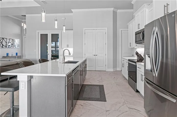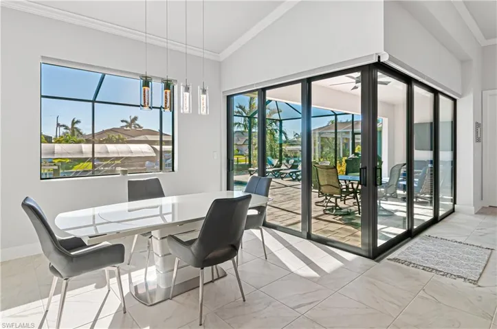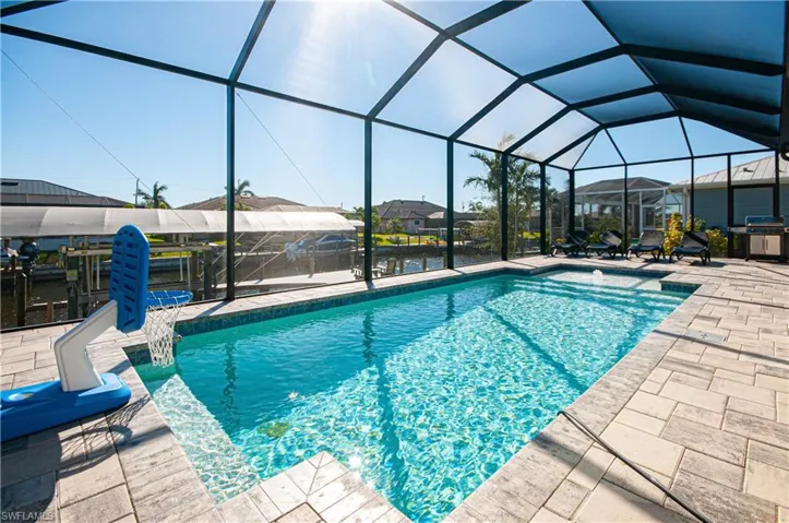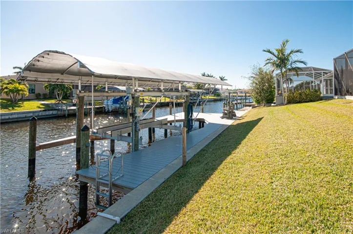 **Substantial price reduction** on this BETTER THAN NEW residence in the highly sought after Surfside neighborhood. The circular driveway with 3 car garage and impressive entrance make you feel at home as you pull up to this special property. Make note, this home comes fully furnished/turn key with highly upgraded furnishings ($75,000 in upgrades including furnishings) and was rarely used, no pets or renters. You will be welcomed by the soaring volume ceilings of this great room concept home. The large zero corner sliders add to the charm of the home and opens up the inside to the outside for the joys of entertaining in the covered lanai and screened pool area, this is truly South Florida living! Be impressed by the upgraded kitchen that comes with added roll out drawers and a walk-in pantry with special shelving for efficient organization. The white/gray granite countertops add to the elegant feeling of the kitchen and baths along with the Italian porcelain tile floors throughout. Enjoy the lovely water view as you dine in the dining area, at the oversized kitchen island or at the lanai table. The WOW factor continues as the Primary bedroom overlooks the pool and boasts 2 walk-in closets, double sinks in the bathroom along with a full tile walk in shower and soaking tub. 2 large guest bedrooms and a full Bath with tile tub/shower are private and the bath also has a pool entrance. For your convenience, there is an office with glass French doors off the entry. The sparking heated salt water pool has a sun shelf with bubbler and full screened enclosure. Boaters will rejoice when they see the custom dock and boat slip built by HONC Construction. No expense was spared in this build, Trex decking, large entertainment area, wrap around boat service decking, 13,000 # lift with remote control, full canopy, double kayak deck mount launch and the boat well is designed to handle a boat up to 38 feet (cost of this new dock was $68,000). This custom home was recently built, high and dry for no worries, by Tracey Homes and features solid construction with impact windows and doors and concrete tile roof. Surfside neighborhood is a highly coveted area in Cape Coral, and this home is perfectly located on the water but a short walk to the Shops on Surfside with tiki bar, restaurants, coffee shops and shopping.