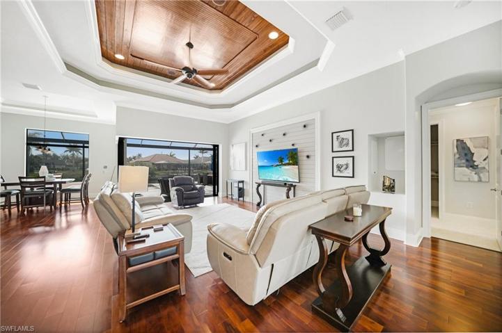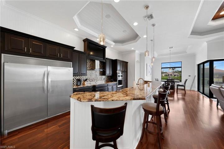 Throughout the home, elegant tray ceilings, 8-ft doors with 7-inch baseboards, and crown moldings add a touch of sophistication. The gourmet kitchen is a chef’s delight, designed with family gatherings in mind. Highlights include an oversized island, stainless steel appliances including a double refrigerator-freezer, built-in oven and microwave, and even a built-in television.