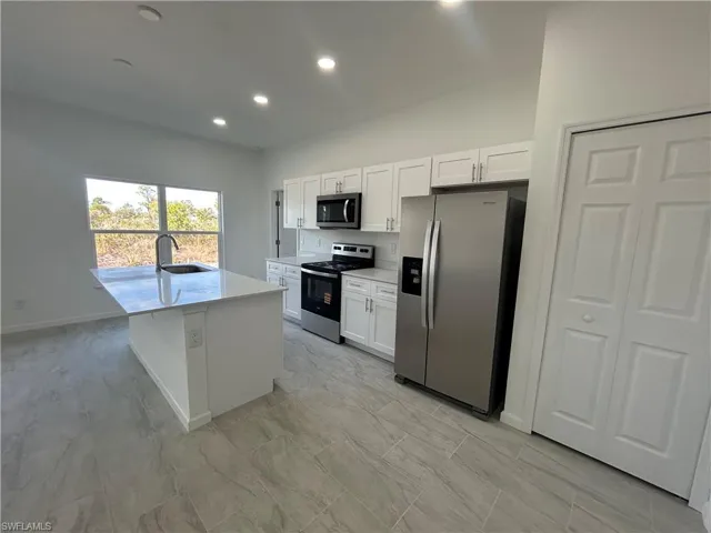 Welcome to your brand new home in Lehigh Acres, FL! This spacious 4-bedroom / 2-bathroom house is ready for you to be the first to call it home. The modern open floor plan features a great room and gourmet kitchen with a large island, perfect for entertaining. The kitchen is equipped with stainless steel appliances, granite counters, and a full appliance package, including a large pantry. The primary bedroom boasts an ensuite with dual vanities, a large tiled shower, and his and hers closets. The house also features a large inside laundry room with washer and dryer hookups, a two-car garage. There is beautiful tile flooring throughout the home, coffered ceilings in the primary bedroom and great room, and modern lighting and fixtures add a touch of elegance. The house is pet-friendly and comes with impact windows for storm protection. Located close to downtown Lehigh and SR 82, it offers easy access to FT Myers and all amenities in Lehigh Acres. With a large backyard, covered rear lanai and lots of natural lighting, this house is one of the lowest-priced new constructions in the area.