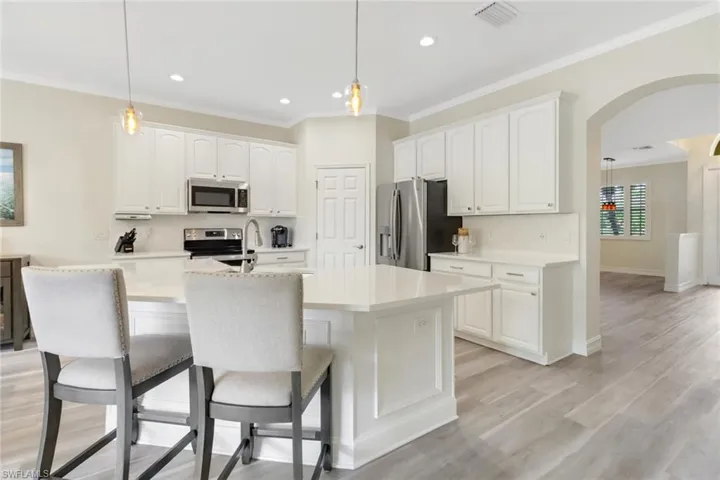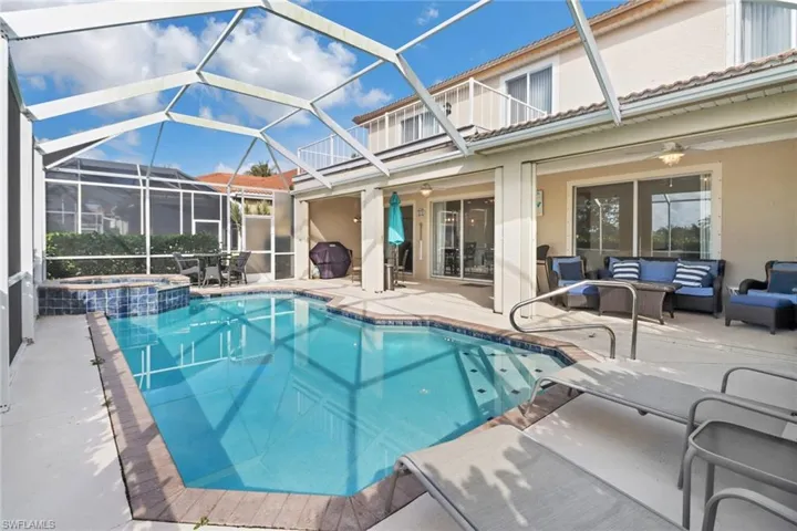 Recently renovated 2 story pool home in Marbella at Spanish Wells. Rare 4 bed/3 bath and over 2,700 square feet of living space. Beautifully updated with all new flooring, paint, light fixtures, quartz countertops in kitchen and new stainless appliances. Sold Turnkey Furnished! The primary bedroom is a true oasis with large ensuite bathroom, walk in closet, large sitting area and private balcony overlooking the golf course and pond. The main floor includes a guest bedroom and bathroom. Step outside to the lanai with pool, spa and oversized covered outdoor living space! Marbella includes 2 swimming pools with club houses. Spanish wells offers golf and social club memberships featuring a 27 hole golf course, clubhouse, restaurant, pickleball, tennis, bocce ball, large community pool, fitness center and more! Perfectly located close to shopping, restaurants and just a short drive to Bonita Beach.