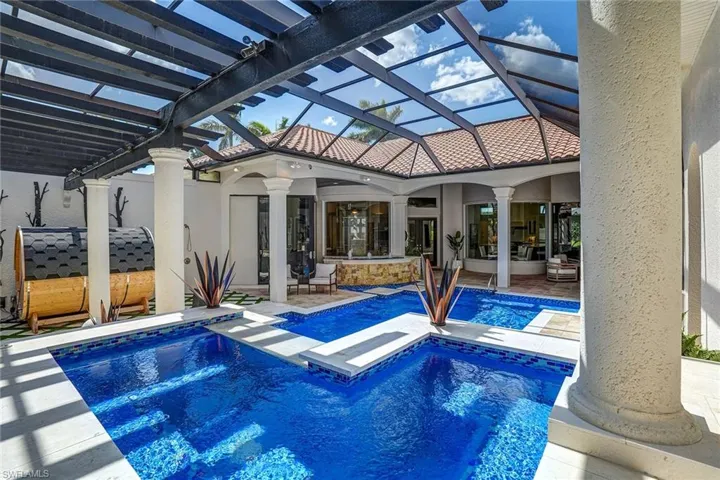 Welcome to an extraordinary custom estate located in the Terabella neighborhood of Renaissance in Fort Myers. On a private .49-acre homesite, this architectural masterpiece offers breathtaking sunset views overlooking the lake and golf course. This unique courtyard estate features a resort-inspired lifestyle that is one of a kind. The property features two stunning pools and two outdoor kitchens that create a seamless indoor and outdoor living experience. The residence has been thoughtfully remodeled with amazing finishes and modern elegance. The chef’s kitchen is a showstopper, boasting double quartz islands, luxury appliances and custom cabinetry. The expansive great room flows effortlessly to the central courtyard oasis, where you’ll find a beautifully redesigned pool and spa, walk-in sauna and summer kitchen. The four private en-suite bedrooms are positioned ideally throughout the property. The luxurious primary suite is adorned with wood-look tile, a spa-inspired bath, an oversized custom closet and direct outdoor access to both pool areas. Two of the private bedrooms with en suites are positioned in the courtyard area offering private access while the third guest suite is in the main interior but also offers access to the courtyard area. Go beyond to the rear outdoor living area, where you will find a cozy sitting area with a fireplace for intimate gatherings, infinity-edge lap pool, rock waterfall, oversized patio and second outdoor kitchen that creates a spectacular backdrop for entertaining against the panoramic golf, lake and sunset views. Additional features include a new whole-home generator with 500-gallon propane tank, oversized two-car garage plus separate third garage with car lift to accommodate up to four vehicles, exquisite ceiling details throughout, custom window treatments and more. Experience one of Renaissance’s iconic estates as it combines timeless design, superior craftsmanship and an unbeatable location. The Renaissance lifestyle offers an Arthur Hills championship golf course with memberships available immediately, a lavish resort-style pool and pavilion, a children’s play area, a full-service spa and fitness center, six red clay tennis courts, two pickleball courts and two bocce courts.