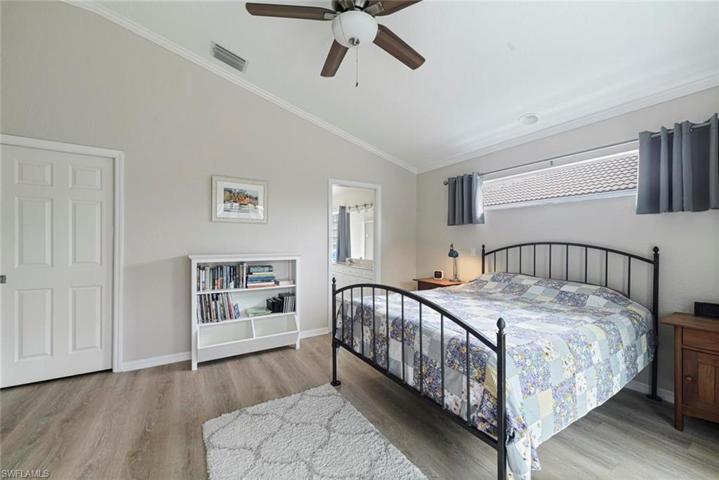 On an appealing tree-lined cul-de-sac, this home is a unique opportunity as an expanded version of a popular floorplan – a full 168sf more. 2 beds + Den, 2 baths, a larger dining area and guest BR, a full INSIDE laundry room and extended 2 car garage. Inside an inviting great room has pleasing paint colors, tile flooring and crown molding. Gorgeous updates include a galley kitchen with stainless appliances, granite counters, tile backsplash and open breakfast bar or entertain with a summer kitchen on the lanai that features grill, granite counter with stone base and mini fridge. Every room has crown molding – even the laundry. New LVP is found in bedrooms and tile in the main living areas. A split bedroom floorplan with an updated hall bath gives guests privacy. The adjacent full laundry room leads to an oversized garage for two cars PLUS golf cart. An attractive den/office/hobby room with French doors and leaded transom window also has sliders out to the lanai. The spacious primary bedroom has an ensuite bath with dual vanity, soaking tub and shower. New hurricane-rated sliders lead from the bedroom to the pool deck for a morning dip. You’ll enjoy a pool that’s warmed in winter from southern exposure. A deep landscaped back yard offers privacy, plus a grassy area for your pet. Hurricane shutters completely protect the lanai, accordion shutters protect all other windows. And a new roof in Dec 2023 will give you peace of mind for years to come. Come see why this one is special!