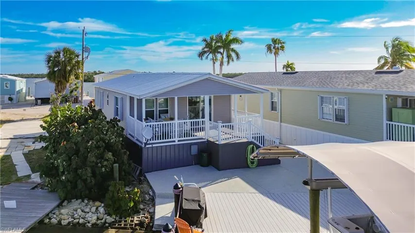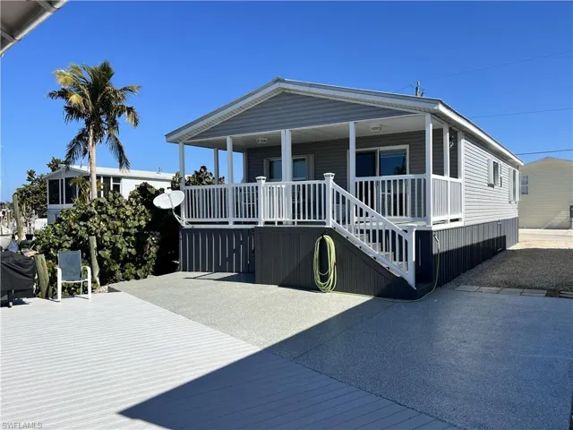 A Boaters Dream on San Carlos Island, un-incorporated Fort Myers Beach. Huge new deck and boat lift for quick access down the canal into the wide open bay & Gulf waters in the Southwest Florida sunshine! This elevated, remodeled manufactured home sits perfectly on the lot for plenty of parking and waterfront entertaining area. Walk up the steps to a great covered porch, sliders that lead into an open floor plan with kitchen, dining and living area. The Master bedroom has a private bathroom and plenty of closet space. Guest bedroom, guest bathroom and laundry room with new washer & dryer in the residence. Kitchen has all new appliances, cabinets and granite countertops. A new metal roof was installed in 2022. Walk to delicious waterfront restaurants, local bars, marinas and shops. The Key West Xpress, charter boats, and local shrimp & seafood boats with the fresh catch of the day are right down the street. A quick stroll over the bridge to the white sandy beaches, more bars, restaurants and entertainment. Make this your full time home, a rental or your seasonal residence with the best long-time locals and snowbirds as your neighbors. You and your guests are going to love it here!