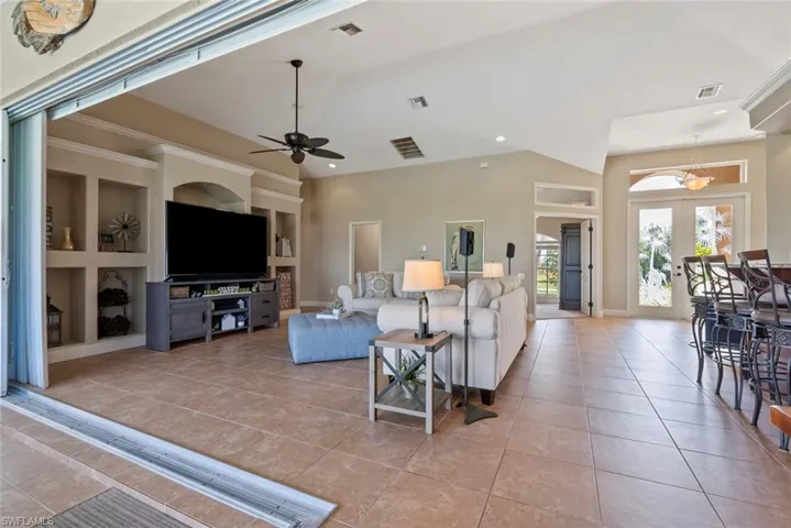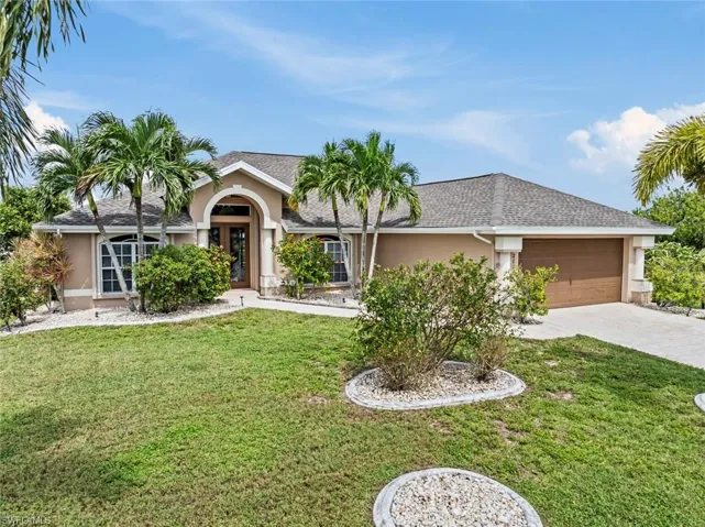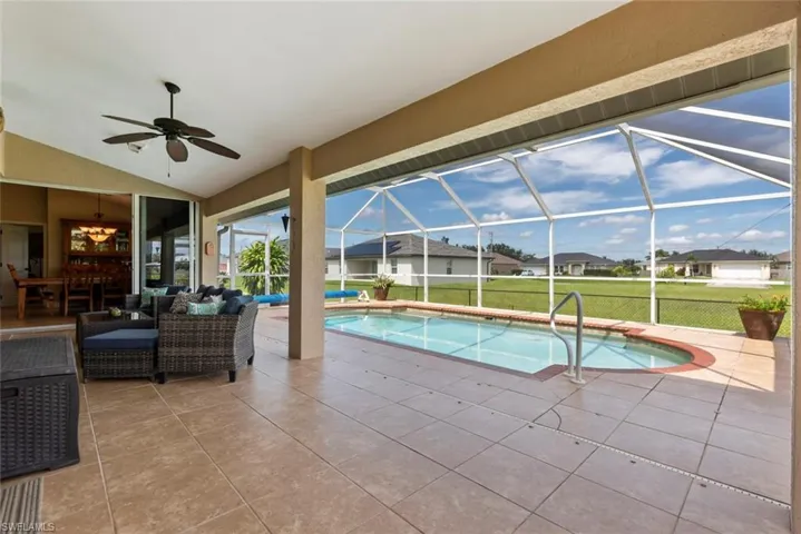 Welcome to this beautiful open-concept pool home in the rapidly developing area of NW Cape Coral. Stepping through the artistically frosted French front doors, you enter the great room featuring cathedral ceilings, a custom built-in entertainment center, and extra tall, 90-degree zero-corner pocket sliding doors, infusing the interior with natural light and seamlessly blending indoor and outdoor living; offering the perfect setting to take advantage of the Florida sunshine year-round. Enjoy the same view from the open kitchen which boasts granite countertops, newer stainless steel appliances, a spacious pantry, and a built-in desk. The den provides a cozy retreat with French doors and is located off the great room. The owner’s suite includes dual closets and a generously sized bathroom with separated vanities and a large walk-thru shower. The pocket sliding doors from the primary suite to the lanai provide full access to the saltwater pool and outdoor entertainment. The split floor plan features the two guest bedrooms on the other side of the home; sharing the second bathroom which also serves as the pool bath allowing access to the lanai. This property also has a fenced rear yard. The home features accordion shutters, a new roof (installed in 2023), a new salt generator, new pool filter and valves, and new screens on the pool cage. Additionally, the owners have an existing assumable flood insurance policy. Please take notice that a video tour is available!