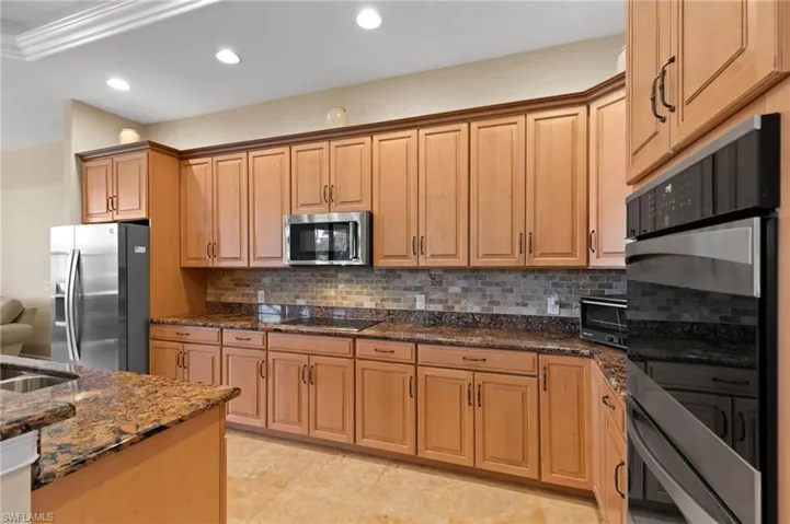 A disappearing slider opens to more than 1,000 square feet of fully screened outdoor living space finished with 20/20 super screens and elegant pavers. The heated saltwater pool is ideal for lap swimming and features newer Pentair equipment and night lighting. The outdoor area also includes a full bathroom and a well-appointed kitchen with a JennAir grill, downdraft, bar seating, and a fridge, perfect for relaxed evenings overlooking the lake and its illuminated fountain.