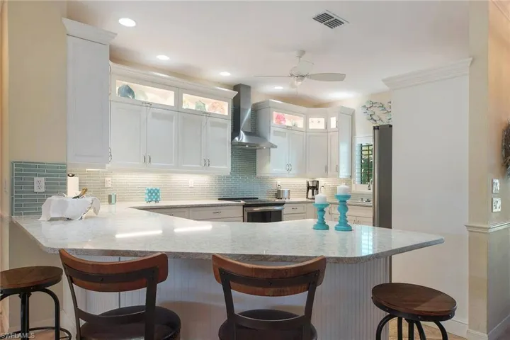 Villa Aquamarine is a beautifully appointed dream vacation destination – truly the jewel of Bonita Shores. Spacious corner lot provides the ideal setting for the panoramic outdoor mecca complete with heated pool and waterfall, summer kitchen, beach sun shelf with loungers, outdoor shower and a southern and western exposure. The spacious under truss area provides the finest in cooking, lounging and dining amenities and is adjacent to the sparkling pool overlooking the gorgeous tropical landscaped yard complete with fencing. The interior is totally up to date and skillfully decorated with careful attention to every detail. There are three full bedrooms, two baths and a large kitchen with breakfast bar and expansive dining/living area perfect for entertaining and relaxing. The kitchen was totally updated and newly equipped with all that you will need for total enjoyment. The three bedrooms and 2 baths are also fully updated and the coastal colors and decor flow throughout the house. The location is ideal as you are close to the best beaches in SW Florida as well as the best variety of dining and shopping in Bonita and Naples.