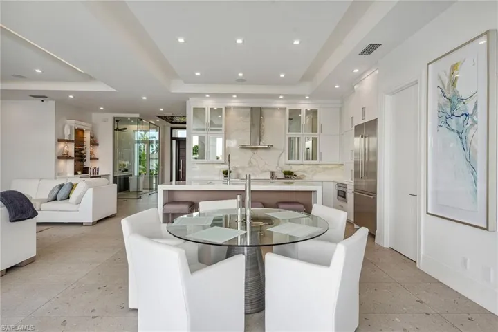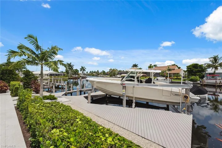 Experience modern luxury and exceptional quality throughout this contemporary custom-built single-family waterfront pool home, constructed in 2019, and offered beautifully furnished. Nestled on a tranquil waterway with Gulf access and beautiful views, this residence features a private boat dock with two separate lifts, including a 30K lift. The open floor plan spans 2,516 square feet of living space, including three bedrooms, a den and three full baths. This exquisite home is equipped with a central vacuum system, home automation, control 4 lighting, electric window shades and surround sound for ultimate convenience. A SWAT mosquito system around the pool area ensures a pest-free environment for your outdoor enjoyment, while underground fencing in the front and back provides a secure space for your pets. The exterior boasts a sleek metal roof, impact doors and windows and a spacious lanai overlooking the water. The lanai features covered and uncovered outdoor living with a gas fire pit, and a heated saltwater pool and spa with a waterfall, creating a serene oasis for relaxation and entertainment. Inside, the home is furnished with contemporary elegance, with large format porcelain tile flooring, recessed lighting and volume and tray ceilings. The foyer leads to a bright and airy great room with dramatic glass sliders that open completely to the lanai. The great room and dining area have tray ceilings with rope lighting, a built-in entertainment center and a gorgeous modern chandelier. The kitchen is a chef’s dream, with white modern cabinets, under-cabinet lighting, quartz counters, a beautiful backsplash and a walk-in pantry. The quartz waterfall island and Thermador and Bosch stainless steel appliances, including a convection cooktop with hood, a built-in microwave, a wall oven, a refrigerator/freezer and a dishwasher, provide functionality and style. Adjacent to the great room and kitchen, a custom bar with shelving, wine storage and a beverage fridge makes entertaining a breeze. The owner’s suite offers access to the lanai, two walk-in closets with custom shelving and cabinets, and a spectacular en-suite bath with dual vanities, full-width mirrors with quartz countertops, a large walk-in shower and a separate soaking tub with stunning accent tile on the wall. One of the guest bedrooms offers lanai access and water views, while both guest bedrooms feature adjacent or en-suite baths with LED mirrors, and walk-in showers tiled floor-to-ceiling with frameless glass enclosures. The den/study offers a quiet space with glass doors, while the laundry room includes a utility sink with storage cabinets, a ceramic tile backsplash, under-cabinet lighting, sink, and Samsung front-load washer/dryer. The two-car garage features built-in storage shelving and epoxy flooring. This home provides easy access to all that Marco Island offers, from pristine beaches to dining, boutiques, golf, pickleball, tennis, yacht clubs, kayaking, libraries, parks and schools.