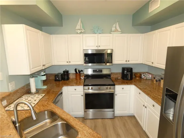 Stylish 2-Bedroom Condo with Den in Gated Community – Resort-Style Amenities! Welcome to this beautifully updated 2-bedroom, 2-bath condo with a versatile den/storage room, ideally located on the second floor with elevator access. Spanning 1,203 square feet, this inviting condo features new stainless steel appliances, granite countertops, and updated flooring throughout. Enjoy the convenience of in-unit laundry, assigned covered parking, and an exterior storage room. Relax on your private screened-in balcony overlooking serene nature views—your perfect retreat after a long day. The community offers a wealth of resort-style amenities including a sparkling pool, spa, fitness center, bocce ball, tennis, and pickleball courts. Located in a secure gated community with a newer roof, this property also includes cable, water, and trash removal in the HOA dues. Situated just minutes from downtown restaurants, shopping, and entertainment, this condo is the perfect blend of comfort, convenience, and lifestyle. Plus, a structural study has been completed and reserves are fully funded—move in with peace of mind!