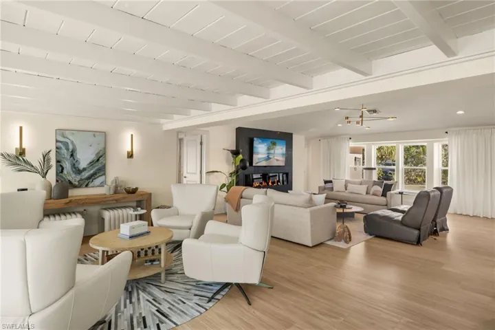 In a secluded corner of paradise, where the streets are named for seashells and sunlight glistens on the ripples of winding canals, a rare masterpiece awaits. Here, in one of the region’s beloved boating communities, life unfolds at the water’s edge, graceful, unhurried and framed by beauty at every turn. At quiet end of a private lane, an oversized estate lot commands an exquisite position embraced by wide, intersecting canals that shimmer with tranquility. From dawn to dusk, sweeping water views set the stage for moments of reflection and wonder. It is not uncommon to see dolphins gliding past or boats drifting lazily toward the open Gulf, a gentle reminder this is no ordinary address. Inside, light pours through every window, illuminating an interior that has been wonderfully reimagined for modern living. The living room greets you with soaring vaulted ceilings, a sleek linear fireplace, and a sense of calm sophistication. The kitchen, equally elegant, is a symphony of craftsmanship, custom cabinetry, open shelving, and stainless-steel finishes surrounding a striking island where friends gather and laughter lingers. Each of the five bedrooms tells its own story, private sanctuaries where morning light shimmers on the water and the day begins with quiet inspiration. The four baths, individually designed, offer a touch of artistry and serenity, transforming the everyday into something extraordinary. Beyond the glass, an intimate seating area beneath a beamed, wood-inlaid ceiling opens to the caged pool and sweeping lawn, where tropical breezes carry the scent of salt and sun. At water’s edge, your private dock and boat lift promise effortless access to open water, just minutes from adventure, yet a world apart from everything else. This is more than a home, it is a celebration of place and possibility. In a community where charm and character are timeless, finding such a fusion of design, serenity and waterfront prestige is nothing short of extraordinary. Here, coastal living becomes art.
