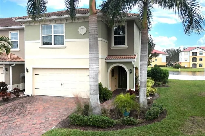 LARGEST END UNIT TOWNHOME IN GATED HAMMOCK COVE. MORE THAN 2000 SQ FT OF FURNISHED LIVING AREA. 2-CAR GARAGE. STUNNING LAKE VIEW. This unit has the roominess and open feel of a single-family home but offers a carefree lifestyle with all yard maintenance provided. Downstairs has a sprawling great room and a formal dining area with warm traditional decor and comfortable furnishings. The kitchen is open to the living area with a flat breakfast bar. Granite counter tops with plenty of upgraded cabinet space. Walk-in pantry includes surprising understairs storage. There’s a downstairs powder room just off the entry hall. Tile flooring throughout. The carpeted upstairs has 3 bedrooms and two baths plus a den that could easily be a 4th bedroom or it could be modified to be a lofted space. Twin sinks in primary bath. Huge walk-in closet. A spacious screened lanai overlooks the pet friendly fenced yard. The unique paver patio adjacent to the lanai has room for your barbecues or sun worship. Enjoy nearby neighborhood pool or the Gateway amenities including tennis, pickleball, jogging trails, soccer fields, dog park and huge Gateway community park pool. Low cost optional social or golf memberships at the Gateway CC give you access to even more activities, including gourmet dining and full fitness center. Restaurants and shopping abound. Short trip to SWFL airport or I75. Twins & Red Sox stadiums, Lakes Park & Six Mile Cypress Slough Nature Center all nearby. Easy drive to beaches and Naples. Low fees include cable & Internet.