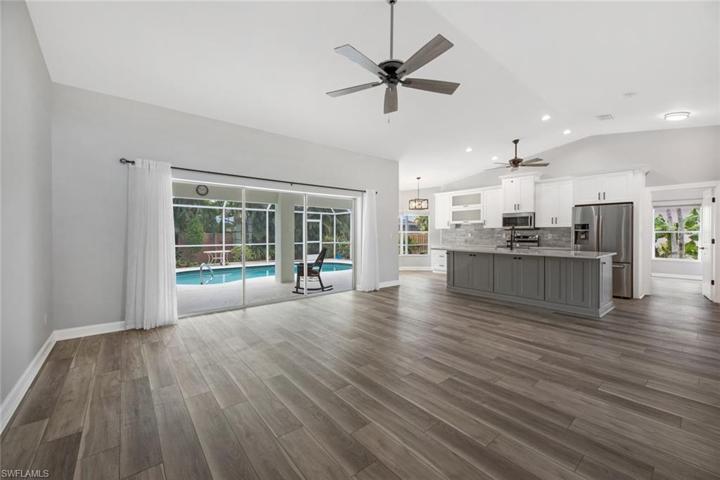 Welcome to Luxury Living in Sunny Cape Coral! This home is an absolute gem, stunning both inside and out and located in a quiet and desirable SW Cape neighborhood. This 3 bedroom/2 bath home offers an open floor plan and is move-in ready. A spacious vaulted great room features disappearing sliding glass doors that opens to the spacious screened lanai providing plenty of room for both outdoor living and entertaining. Just naming a few of the many recent updates include extra high kitchen cabinetry, kitchen island and countertops, flooring throughout, stainless kitchen appliances, ceiling fans, both indoor and outdoor paint, and exterior landscaping. This home’s location is everything, just minutes from downtown, shopping, restaurants, and white sand beaches. Assumable and inexpensive flood policy available all with no assessments. Don’t let this wonderful opportunity slip away. The price of this home is just as attractive as its features. Don’t just dream of paradise—make it yours today.
