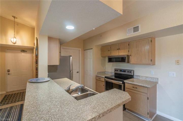 ensuite privilege, vaulted ceilings, plenty of natural light, is perfect as an INVESTMENT property as well as your PRIMARY residence or SECOND HOME. Low HOA fees and Property Tax. Conveniently located in 2nd building, right of the clubhouse, to enjoy the resort pool. Recently remodeled: Stainless steel kitchen appliances, new washer and dryer, and pergo flooring throughout. The bedroom has a beautiful water and fountain view. Remodeled clubhouse, 24 hr fitness center, resort style pool, spa, gazebo, bbq, tennis court, pickle ball, business center, 5-day valet trash pick up at your door, car wash area, playground, dog park, RV/Boat storage, and reserved parking space. Close proximity to Seed to Table and North Naples Regional Park; 5 minute drive to the Mercato, Vanderbilt Beach, Wiggin’s Pass, The Ritz, easy access to I-75, 20 minutes to airport and Downtown 5th Avenue.