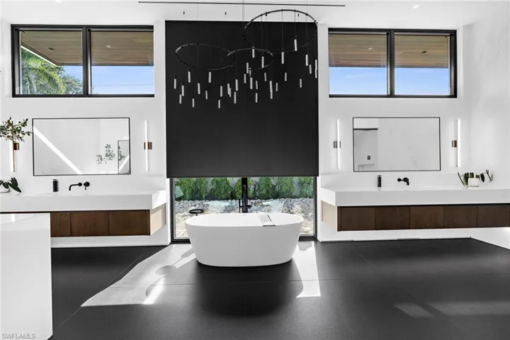 Step into luxury with this recently completed masterpiece, crafted over the span of three years by Big Island Builders. Architectural design completed by Kukk Architecture and Design, along with interior and landscape design by Bellevue Creative. This estate spans over 11,500 square feet, offering seamless indoor/outdoor living where details and quality are uncompromised. The interior is a showcase of modern design, beginning with a gourmet kitchen featuring double, 15-foot islands, Ruffino Cabinetry, Miele appliances, and a full butler’s pantry. Dine in elegance under a show-stopping chandelier at your custom oak dining table with a 200+ bottle refrigerated wine display. The home’s layout provides five bedrooms, an office, a full gym with sauna, and separate guest house. The master wing is a sanctuary with an expansive sitting room, morning bar, and a luxurious bathroom boasting a steam shower, double sinks with vanity, floor-to-ceiling tile, and an elegant freestanding air bathtub. The outdoor space is a true Southwest Florida oasis, featuring a two-lane lap pool, a chiller for transforming the jacuzzi into a cold plunge, a sizable sun shelf, and extensive outdoor amenities. The area is fully equipped with an automated screening system, encompassing a large kitchen, living, and dining space. The guest house adds to the estate’s allure with its own kitchen, dining area, and private terrace. This home features over 3,000 square feet of hurricane-impact windows including 12-foot sliders for breathtaking views and natural light. An impressive 13,000 linear feet of bleached then stained mahogany completes the ceiling detail and brings a warmth to the cool tones throughout. Exterior enhancements include Neolith tile and architectural metal wall louvers topped with a solid concrete roof for added storm protection. The home is managed by a fully integrated Control4 system controlling every aspect of home automation, including a Colorbeam lighting system. The property comes with a sophisticated furniture package valued at $300,000, featuring brands such as Rene Cazares, Sonneman Lighting, Brown Jordan, and a Naples Custom Furniture master bedroom set, completing this epitome of luxury living in Naples.