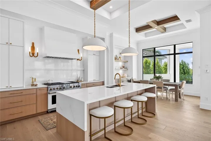 Welcome to an exceptional new construction waterfront estate in the heart of Marco Island. This luxury residence, built by Stonebreaker Builders, offers 5 bedrooms, 5.5 bathrooms & is ready for immediate occupancy. A private courtyard entry sets the tone, leading to an elegant foyer that opens into a thoughtfully designed first floor with 13-foot tray ceiling & wood beams, along with engineered oak flooring throughout. The great room showcases an electric fireplace, floating shelves, all enhanced by an Executive Electronics low voltage package with speakers & prewire for TVs, cameras & more. Seamlessly connected, the dining area is appointed with a wine cooler & standalone ice maker, perfect for entertaining. The chef’s kitchen is a true showpiece, featuring custom inset Wood Harbor cabinetry with appliance panels, quartz countertops & premium Wolf & Sub-Zero appliances, with gas cooking. A fully equipped scullery enhances both function & style, complete with a full-height Sub-Zero beverage refrigerator. The luxurious primary suite offers access to the covered lanai & features a customized walk-in closet. The spa-like bath is finished with dual vanities, gold fixtures, custom marble tile, a soaking tub & a walk-in shower. The first floor also includes a guest bedroom or study with ensuite bath, a beautifully appointed powder room with quartz countertops & gold toned hardware & a laundry/utility room. Step outside to your expansive waterfront lanai, where breathtaking views of Collier Bay create the ultimate backdrop. The heated pool with flush hot tub features a sun shelf & extended bench, set on a custom mud set pool deck stone, ideal for relaxing or entertaining. With the touch of a button, roll-down hurricane shutters & screens provide protection & comfort. An outdoor shower adds convenience & the property is further enhanced by a whole house Generac generator with a 1,000 lb underground propane tank (additional gas rough-in available for an outdoor kitchen or grill). Upstairs, a striking white oak & black iron staircase leads to a spacious second level. A large bedroom suite offers the flexibility of a second primary, complete with a walk-in closet & an ensuite bath finished in marble, quartz & gold toned accents. The loft area features tray ceilings, a beverage cooler & a wet bar, perfect for a secondary living space. A second-floor laundry adds convenience, along with two additional guest bedrooms, one with lanai access, walk-in closet & a terracotta-accented bath & another with a walk-in closet & shared ensuite with the loft area. Additional highlights include impact-resistant PGT & Windoor windows & doors, a 3-car garage with epoxy flooring & rear garage door access to the backyard, a custom paver driveway, an aluminum roof & an elevated first floor height of NAVD 11.33 for added peace of mind. This home encompasses 4,448 sq ft under air & 6,689 total sq ft, delivering a seamless blend of luxury, comfort & waterfront living.