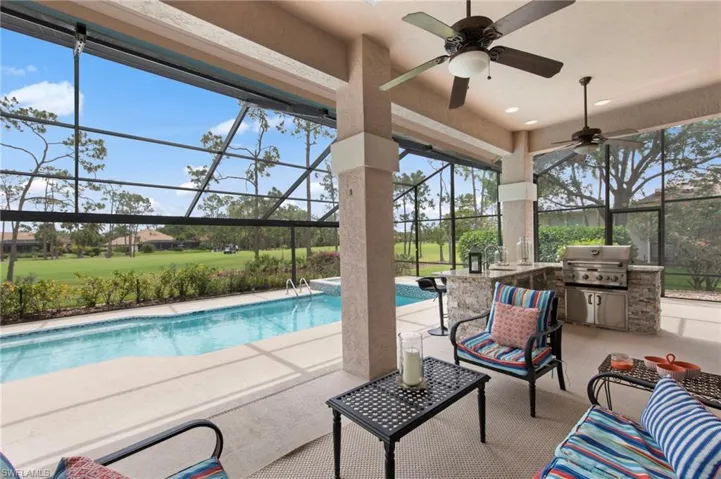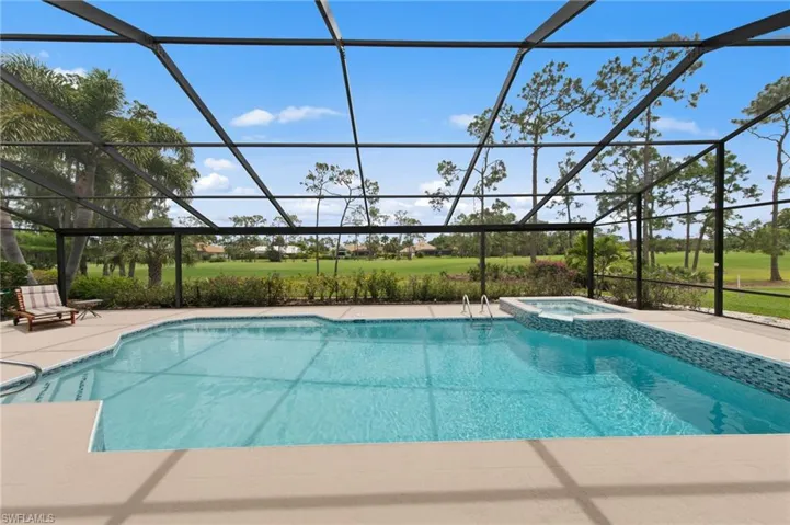 Set on an oversized lot with sweeping golf course views, this renovated, move-in-ready residence in Wildcat Run offers privacy, space, and effortless indoor-outdoor living. A long brick paver driveway provides ample parking and a welcoming approach. Soaring ceilings and abundant natural light enhance the open great room and seamless flow, while a split floor plan lives larger than expected, offering comfort and functionality throughout. A rare, picture-perfect home with no need for renovation, ideal as a full-time residence or winter retreat. Warm wood-look tile flooring flows through the main living areas, complemented by new high-end Karastan carpeting in the bedrooms. The chef’s kitchen is designed for both everyday living and entertaining, featuring a 14-foot island, custom soft-close cabinetry, quartz and granite countertops, tumbled marble backsplash, induction cooktop, Café-style refrigerator, built-in wine cooler, and layered lighting. The primary suite offers a private retreat with sitting area, custom walk-in closet, and a beautifully updated bath with soaking tub, dual vanities, and walk-in shower. Guest bedrooms and baths are equally well appointed, including a full guest bath that also serves as a convenient pool bath. The panoramic screened lanai captures tranquil golf course views and elevates the home’s outdoor living. Enjoy a recently refinished pool and spa, freshly painted lanai deck, outdoor kitchen, and generous covered areas for year-round use. Additional improvements include impact-rated windows and doors (2022), a newer roof (2016), refreshed landscaping, and a 2024 A/C. Wildcat Run is a low-density community of just over 450 homes on estate-sized lots with rolling fairways, mature landscaping, and abundant green space. Residents enjoy an Arnold Palmer 18-hole championship golf course with no wait for membership, multiple dining venues, pickleball, tennis, bocce, and an active social lifestyle, all ideally located near Coconut Point, RSW Airport, and Southwest Florida’s beautiful beaches.