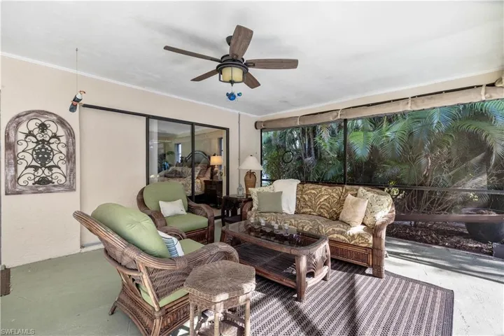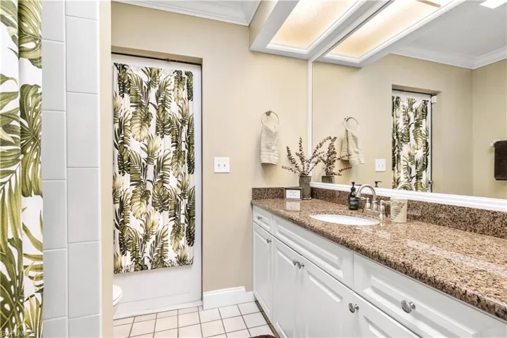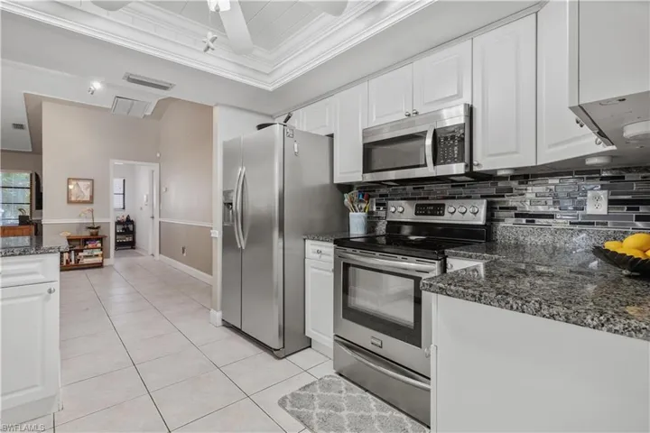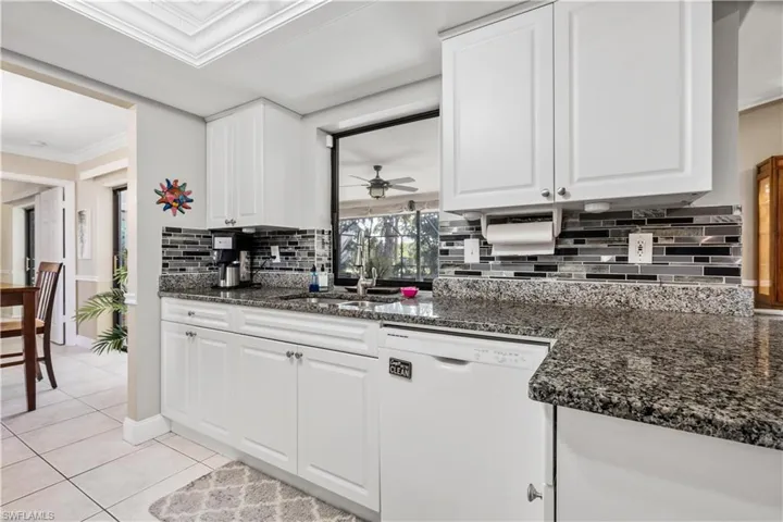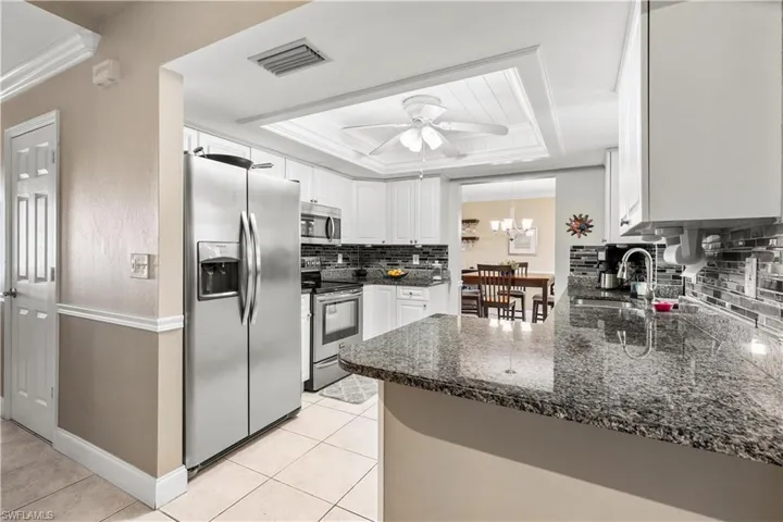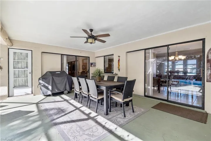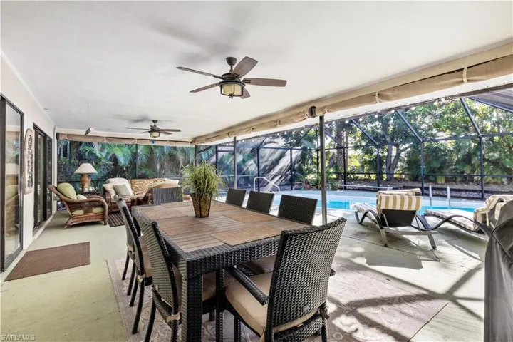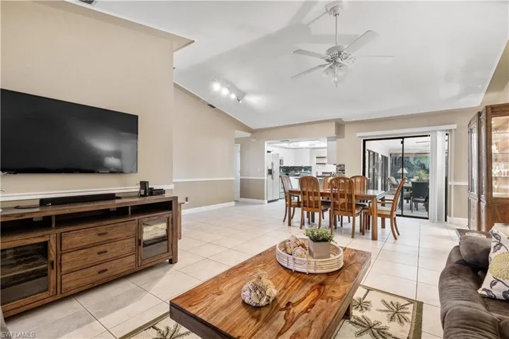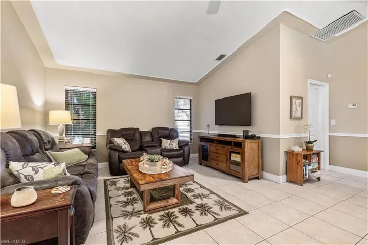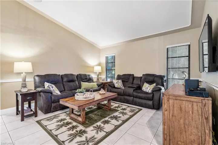 Immaculate 3-bedroom pool home with tile floors throughout, including laminate in the living room for comfort. Features updated cabinets and granite countertops in kitchen and bathrooms, accented ceilings and walls, and a spacious lanai with hurricane curtains where Eureka Palms add privacy to the pool area. Includes a large laundry room with tub and a new roof from 2023. Kevlar Storm panels on all windows and Hurricane rated garage door. Security fence for pool. Not in a flood zone, no flood insurance required by most lenders. Convenient Fort Myers access. Plus, tile floors in the garage!