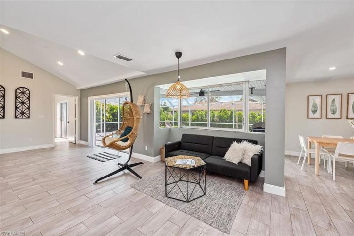 A beautifully remodeled home in highly sought-after Marco Island. This redesigned three-bedroom, 2.5-bath residence offers a generously sized living area flooded with natural light. The open concept design has been thoughtfully updated with wood-like ceramic tile floors and a fresh-painted color palette that seamlessly unites all spaces. The remodeled kitchen is the heart of the home, featuring new Samsung stainless appliances, white shaker-style cabinets, quartz countertops and a large four-seat island with waterfall edge that makes it an ideal place for gatherings. Both bathrooms have been completely revamped, showcasing designer fixtures, exquisite tilework and sleek vanities that resonate with the overall aesthetic of the home. The primary suite provides a serene retreat after a long day with a spa-like bath and walk-in closet. Outside is equally captivating with a screened-in pool and plenty of space for relaxation and entertainment. Additional perks include new Samsung washer and dryer, new sprinkler system, newer water heater, newer pool heater, and a large corner lot with a long circular driveway and two-car garage. Don’t miss this extraordinary opportunity!
