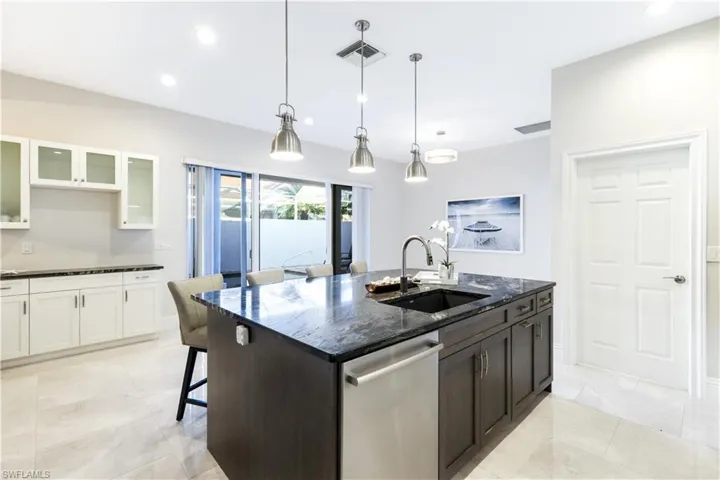 The kitchen standouts, w/tasteful granite, stainless and color selections, featuring built-in wall oven and microwave, smooth cooktop, expansive island, abundant cabinetry; added area ideal for a coffee bar, beverage station, or at-home office nook. Sliding glass doors open directly to the private courtyard, offering ample space for patio furniture, true resort-style indoor/outdoor living while creating an easy flow for any social gathering.