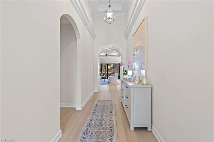 The interior of this residence showcases superior architectural details that provide both aesthetic beauty and long-term value. Custom woodwork, including five-inch baseboards, crisp crown molding, high ceiling foyer and wood-trimmed arched entry, creates a sophisticated, high-end atmosphere throughout the living spaces. The addition of shiplap feature walls and plantation shutters offers a modern coastal aesthetic that is both timeless and highly desirable. The flooring has been thoughtfully upgraded to new COREtec wide planks that offer a waterproof and pet-friendly surface designed for high-traffic durability. These upgraded floors provide superior acoustic insulation and a softer, warmer feel underfoot than traditional tile. The kitchen serves as a high-performance culinary space equipped with a premium GE Cafe slide-in range and microwave, a newer GE refrigerator, and Bosch dishwasher. These selections provide professional-grade reliability and sleek design, complemented by white shaker cabinetry, designer pulls and granite countertops. This combination of style and utility ensures the heart of the home is ready for immediate use without the need for further updates.