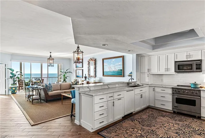 BEAUTIFULLY RENOVATED DIRECT BEACHFRONT CONDO in North Naples’ highly sought-after Barefoot Beach Club. Enjoy front-row, panoramic Gulf views from your private coastal retreat. This 2-bedroom plus den, 2-bath residence offers over 1,600 sq. ft. under air, featuring hurricane-impact windows, electric storm shutters, and stunning wood-look tile flooring throughout. This spacious floor plan includes versatile bonus nooks off each bedroom—perfect for a den, office, or nursery. The chef’s kitchen boasts quartz countertops, crisp white cabinetry, high-end appliances, a charming eat-in area, and a spacious breakfast bar—ideal for casual dining or entertaining. The open-concept living room features custom built-in shelving and entertainment center, all framing breathtaking views of the Gulf. Step out onto the spacious screened lanai to relax and unwind while enjoying endless sunsets over the water. The primary suite is a true sanctuary with private lanai access and a spa-like ensuite bath offering dual vanities and a glass-enclosed shower with multiple showerheads. Conveniently located near the brand-new clubhouse, featuring a resort-style pool with an outdoor kitchen, barbecue area, and entertainment space adjacent to the party rooms. The second floor offers a state-of-the-art fitness center and borrowing library, while the third floor includes a spacious kitchen, expansive entertaining balcony, and large event area perfect for gatherings and celebrations. Barefoot Beach residents enjoy 3 miles of beach, 2 pools/spas, manned/gated entry & on-site mgmt. OPTIONAL “Club at Barefoot” offers tennis, 2 restaurants & beachside food/bev/chair service. Excellent Collier County location minutes to Mercato, Waterside & easy access to RSW Airport.
