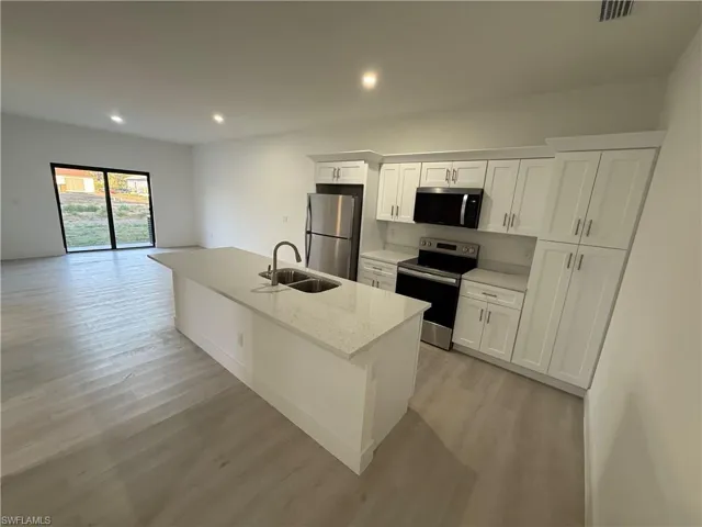 Brand new 3 bedroom, 2 bathroom duplex for rent in Lehigh Acres featuring a spacious open floor plan with modern finishes throughout. Enjoy a bright kitchen with white cabinetry, stainless steel appliances, and a large island perfect for entertaining. The home offers tile flooring throughout, a comfortable primary suite with private bath, and generously sized bedrooms. Includes a 1-car garage, in-unit laundry hookups, and a private driveway.