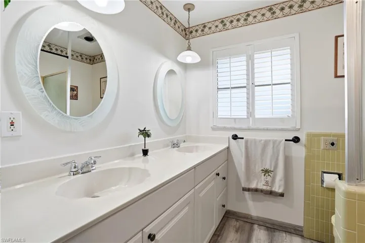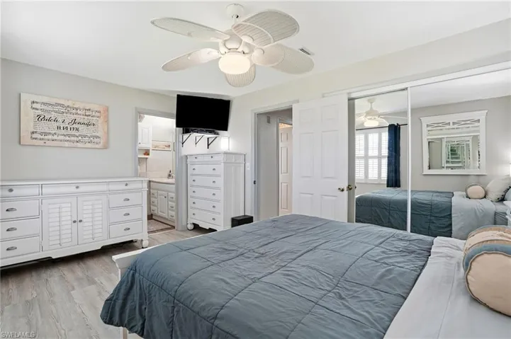 The primary suite includes an ensuite bath, while both guest bedrooms come equipped with Murphy beds, providing flexible space for guests or a home office. Additional highlights include luxury vinyl plank flooring throughout and plantation shutters.