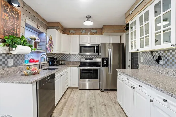 Inside, you’ll love the warm coastal cottage décor, highlighted by a shiplap accent wall, electric fireplace, and barn door in the living room—all overlooking the free-form pool and canal views.