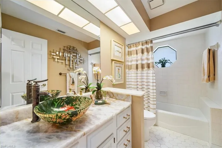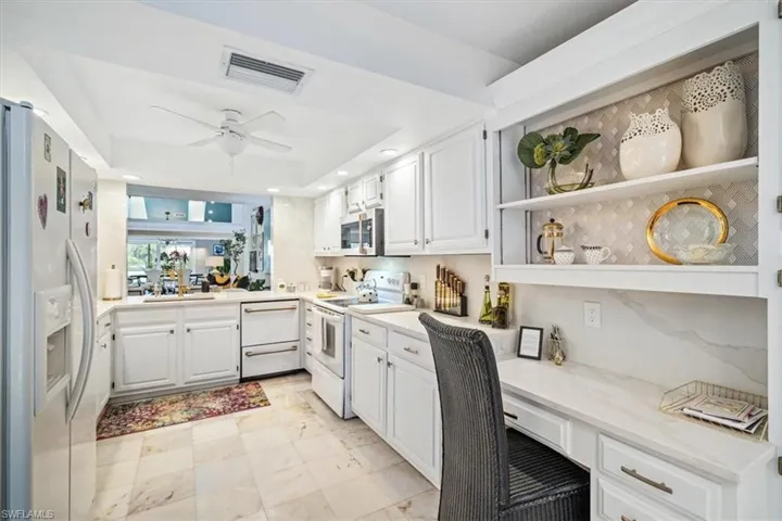 This fabulous villa is a show stopper, professionally decorated and with a fabulous view overlooking the private pool and golf course at Quail Creek Village. First floor primary master bedroom in with beautiful bathroom, first floor guest bedroom with full bath, second floor office/den and guest bedroom en-suite. A fantastic recently renovated kitchen with soothing colored quartz, white cabinets and newer appliances. A large vaulted ceiling living room, formal dining room and family room finish off the first floor with a wonderful traffic flow for entertaining. A charming European sunny courtyard is ready for relaxing with a cool beverage and a book. This is a fantastic value you won’t want to miss.