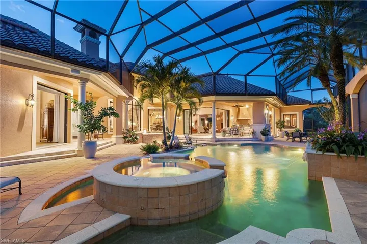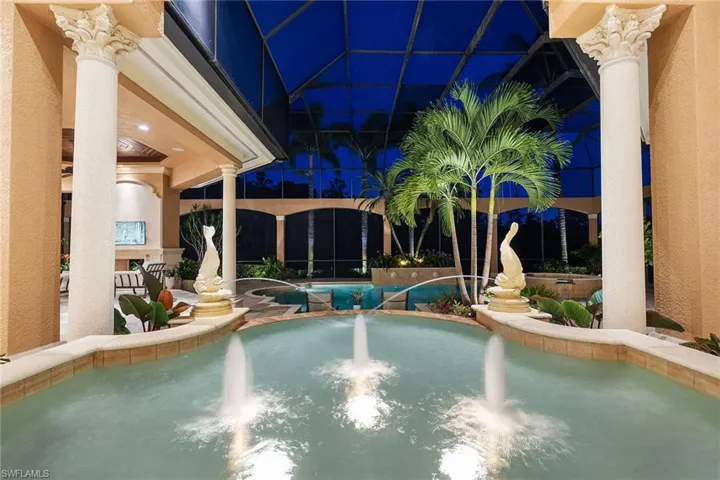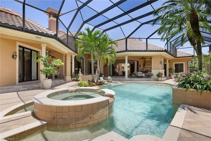 Imagine stepping into a sanctuary where luxury meets peace of mind, in one of the most serene and secure locations. This exquisite home, perched along a tranquil lake and lush preserve, ensures not only privacy but also abundant southern exposure that drenches the space in natural light. From the moment you enter through the grand double doors, you’re captivated by a stunning three-panel window in the living room that frames the multi-level custom pool. This pool, complete with elegant fountains and cascading waterfalls, mirrors the beauty of the surrounding natural landscape. Every detail of this home has been thoughtfully designed, from the intricate coquina stone fireplace to the deep-set display niches that lend the living area an air of sophistication. Wander deeper into the home, and you’ll discover craftsmanship that whispers luxury at every turn such as custom ceiling designs, coquina stone accents, and a walk-in wine room made from rich redwood, conveniently next to a wet bar. The chef’s kitchen is a masterpiece, with custom cabinetry, a dual-fuel range with double ovens and a hidden pantry behind a beautifully arched door. Entertaining here becomes an effortless joy, with pocketing sliding doors that open to a peaceful courtyard and 90-degree sliders that extend the living space to an expansive outdoor area. But this home’s charm extends beyond its aesthetics. It offers something invaluable such as hurricane protection and modern comfort. Impact-resistant windows and doors, combined with a whole-house generator, provide unmatched peace of mind during storm season. You can rest easy, knowing your home and loved ones are protected, no matter the weather. Outside, stone decking wraps around the pool, inviting you to relax by the water, or cozy up by the outdoor fireplace as the day fades. The primary suite offers a luxurious retreat, with triple-stepped coffered ceilings and custom cabinetry in the bath, ensuring every moment here feels indulgent. With four guest bedrooms, each with en-suite baths, and a charming study complete with an aquarium and marble fireplace, this home blends elegance with functionality. In the award-winning Mediterra community, luxury extends beyond your doorstep. Here, you’ll enjoy access to two Tom Fazio-designed golf courses, tennis courts, pickleball and a state-of-the-art fitness center. The private beach club, recently renovated, offers valet parking, sun loungers, a full bar, and alfresco dining, everything you need for an ideal day by the Gulf of Mexico. In this home, you’re not just investing in a property, you’re securing a lifestyle, one where peace of mind, elegance and the best of Florida living converge.