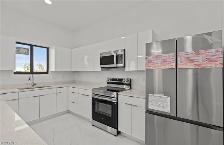 Discover this stunning, move-in-ready new construction home offering 1,904 sq ft of living area located in the fastest-growing area of Cape Coral. Featuring a sleek contemporary layout with 10-foot ceilings and elegant tile flooring throughout, this residence boasts 4 spacious bedrooms and 3 stylish bathrooms. Enjoy a gourmet kitchen with white cabinetry, quartz countertops in both the kitchen and bathrooms, and stainless steel appliances. Bathrooms feature frameless glass-enclosed showers, adding a luxurious touch. A washer and dryer are also included for your convenience. The open floor plan seamlessly connects living, dining, and kitchen areas, while the private backyard offers a peaceful retreat. Built with Stem Wall foundation for enhanced elevation and structural strength, this home also features impact-resistant windows and doors, automatic garage door, irrigation system, and high-end finishes throughout. This property is ideal for families, snowbirds, or investors. Plus, it includes a builder’s warranty 1-2 years and 10-year structural coverage offering peace of mind for years to come. Don’t miss this incredible opportunity to own a high-quality home in a booming location!-WITH SHELVES, FILTER AND BLINDS
