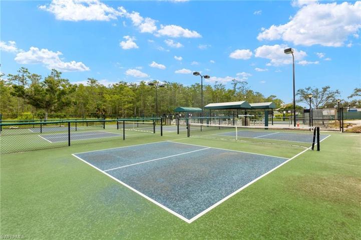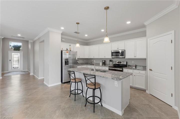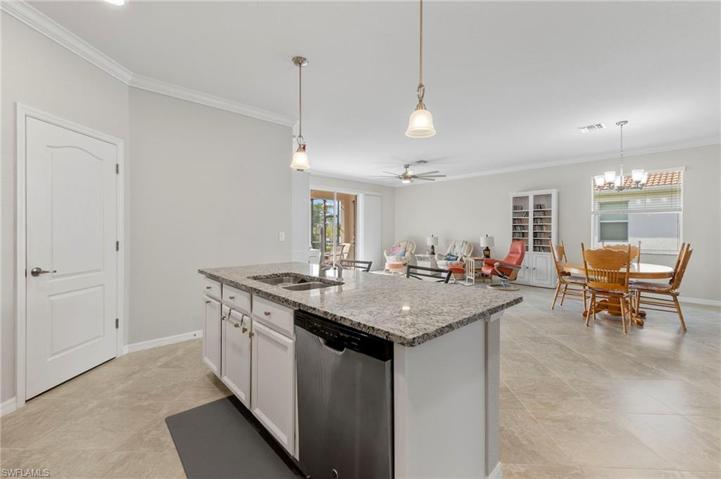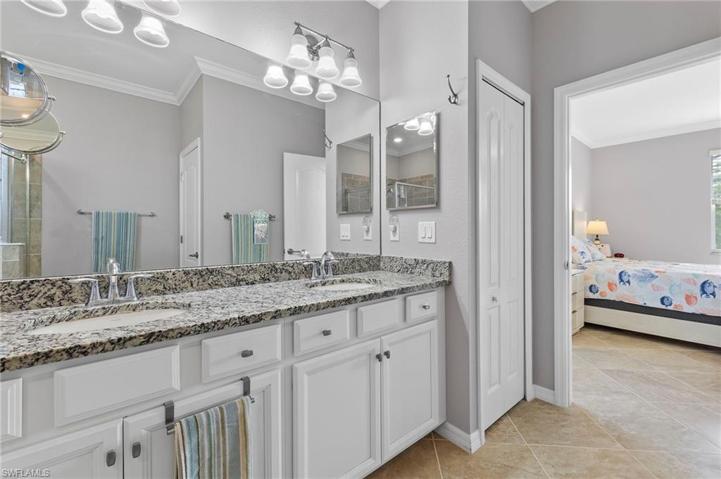This 4-bdrm, 3-bath home sits on an expansive lot, offering privacy that’s a rare find. This fully tiled home was painted 6/23. The open concept kitchen, dining & living are adorned with crown molding that emphasizes the tall ceilings. The black & white granite counters complement the white cabinets along with sleek GE stainless steel appliances. The split bedroom floorplan has 2 bedrooms & bath at the front of the house. The 3rd bedroom is a guest suite with ensuite bathroom. The master at the back of the home has two walk-in closets. The master bath has double sinks, free-standing tub, glass-enclosed shower & private water closet. Outside relax on the paved pool deck by the fire pit which was recently rescreened in 5/23. The heated pool & spa are equipped with remote control settings. The home’s essential systems are well taken care of, with a new water filtration system 5/21 & new water heater 2/21. Hurricane shutters provide added safety. Pelican Preserve is gated & patrolled & offers a golf course, clubhouse, restaurant, bar, & plenty of activities such as indoor/outdoor pools, pickleball, tennis, Bocce, fitness facility, billiard room/card rooms, woodworking shop & theater.