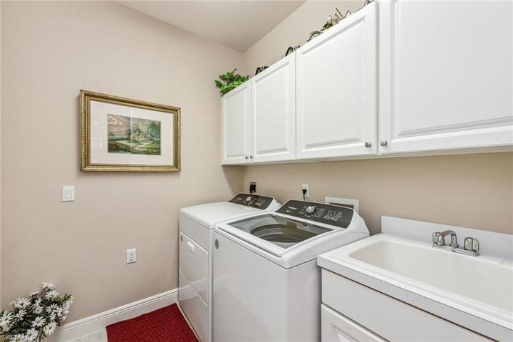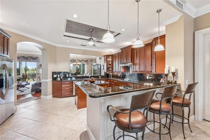 A stunning second-floor unit in the prestigious Hammock Bay Golf and Country Club. This home spans 2,463 square feet offering an ideal blend of luxury and comfort with three bedrooms, 2.5 baths and a spacious two-car garage. As you approach, the southwestern exposure illuminates the property’s exterior, featuring impact doors and windows for peace of mind, a paver driveway, and a large, screened lanai that presents breathtaking views of the lake and golf course. Step inside, you’ll be greeted by an interior that boasts 10-foot ceilings and two-piece crown molding throughout. The hardwood floors in the living areas exude warmth and elegance, leading you into the heart of the home. The kitchen is complete with a tray ceiling, dark wood cabinets with underlighting, granite countertops and backsplash, center island and two breakfast bars, and stainless appliances. Flanking the kitchen are the great room and living room, each offering an effortless indoor-outdoor living experience. The owner’s suite features plush carpeting, lanai access, walk-in closet and a spa-like en-suite bath. This Hammock Bay residence offers an unparalleled lifestyle with access to world-class amenities.