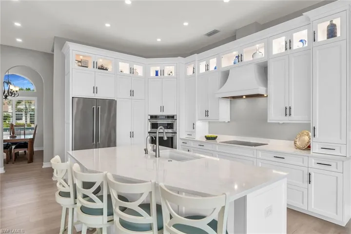 Inside, the open-concept layout highlights high ceilings, elegant finishes, and plenty of natural light that enhances the peaceful atmosphere. The newly updated chef’s kitchen includes stainless steel appliances, quartz countertops, and a bar area, all connected to the dining and living spaces—ideal for both small and large gatherings.