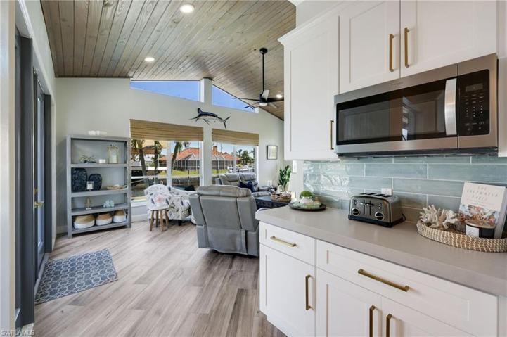 Exquisite 3 bedroom (+2 Dens) & 2.5 bath waterfront haven, ideally positioned just 2 canals away from the serene Caloosahatchee River. Offering you seamless access to the Gulf of Mexico with no bridges to navigate – a dream for sailboat enthusiasts! Luxury awaits, boasting cathedral ceilings & a 2021 remodel that brings modern elegance to every corner. The highlight of the outdoors is the heated saltwater pool & inviting hot tub, providing the perfect setting for relaxation & entertainment. Plus, there’s a convenient covered boat lift for your watercraft. The primary bedroom is a true retreat, with a spa-like en suite bathroom & not one, but two walk-in closets, ensuring ample space for your wardrobe & personal treasures. Adjacent to the primary suite is a versatile office/den, perfect for remote work or as a quiet sanctuary. Gorgeously remodeled kitchen, equipped with a gas range & stylish finishes. Enhancing both the curb appeal & security, this home features beautiful new impact front doors. Climate controlled workshop! The location is simply exceptional, situated in the exclusive Palaco Grande neighborhood, offering a prime waterfront lifestyle in Cape Coral. Don’t miss out!