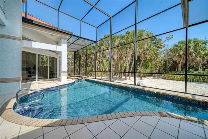 An exceptional offering at The Sanctuary, with beautiful views overlooking the 15th fairway towards the east, alongside ample privacy from this deep beautifully vegetated location. Upon entry, you will be captivated by the soaring 20 foot ceilings with an exquisite rare coral rock facade. Newly landscaped with an opened up view, your eye is immediately drawn through the main living area toward the expansive covered lanai space featuring a freeform Italian stone lined pool along with a spacious backyard. Featuring two primary suites, owners will have the option of one on the main level and an additional on the second level. The kitchen is newly remodeled, and also lives beautifully with a second living / den area affording pleasant views with a panorama wall of windows. Members of The Sanctuary will enjoy Arthur Hills championship course, tennis, pickle ball, lap pool exercise center, exceptional dining and more. New owner will also benefit from the new standing seam roof, new custom Kitchenaid fridge, custom closets for downstairs bedrooms, new paver driveway and new pool equipment including heater. This is an eclectic beauty!