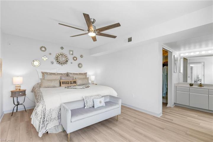 Fully Furnished updated 3 bedroom, 2 bath end unit in Marco Island’s highly desirable, gated, private Steven’s Landing. Free boat dock! Renovated in ’21-23, unit upgrades include new Coretec floors, new kitchen counters, a/c ’23, water heater ’23, new dishwasher & refrigerator, new bathrooms, new lighting, new fans, popcorn ceiling removed, new paint, clean, coastal decor. Full size washer/ dryer in unit. Covered parking w/ storage. Enclosed lanai w/ floor to ceiling windows offers great views of natural vistas while adding to your a/c area! TURNKEY furnished, minutes from Marco’s famous white sand beaches, yet secluded from the hustle of town. A tranquil oasis! Boating with DIRECT GULF ACCESS (no fixed bridges.) Docks w/ electricity, water and fish cleaning station available no charge. Short walk from your condo to the heated, screened resort-style pool/spa, kayaking, tennis & scenic boardwalk through the mangroves to the docks. Storage lot for trailers available! This condo has it all. Eligible for residents’ beach membership. 30 day rentals