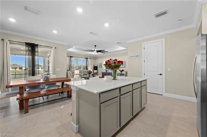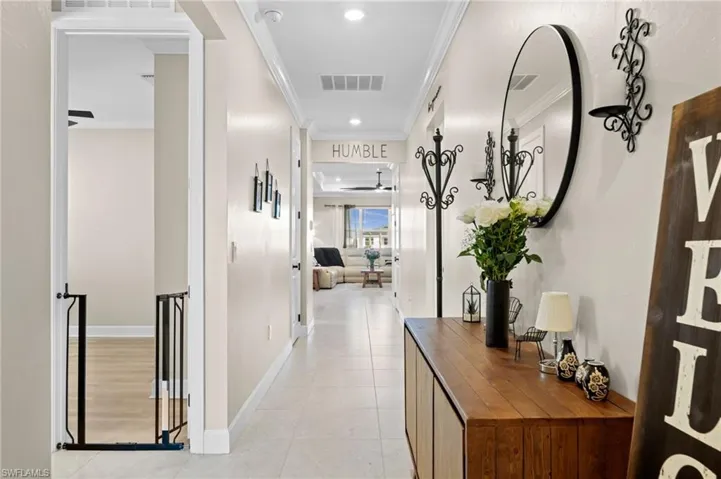 Experience upgraded lakefront living in this meticulously maintained Heston model by Pulte Homes, located in the desirable Verde neighborhood of Babcock Ranch. Offering 4 bedrooms, 2 bathrooms, and 1,850 square feet under air, this home features soaring 9’6″ ceilings and crown molding in the living areas and bedrooms, creating a refined and welcoming atmosphere throughout. Luxury vinyl plank flooring runs throughout the entire home, delivering a clean, modern look and easy maintenance.